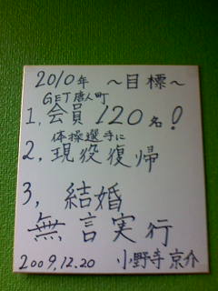 ずばり、 GET唐人町店店長・小野寺京介の 今年の目標は 上の色紙の通りとなっております(↑↑写真) これ以上、説明することは何もはありません。 だって 無言実行ですもん!! 語らずして、黙々と達成してみせます。 右・ハナさんの今年の目標です(↑↑写真) 色紙右端にハナさんの本名が書いてあったので、 それを伏せるべく、微妙な角度になってしまいましたが・・・ ハナさんが何を書いたかと言うと 『人類すべて愛』 ・・・ ・・・ どういうことですかね? ハナさん、愛に飢えているのかなぁ。 2010年、ハナさんの頭の中には何が描かれているのか? 私には理解できませんでした((+_+)) 目標を達成するには まず、掲げることから始めます! 今年は GET唐人町店にとって“勝負の年” このご時世、 生き抜くためには 最大限の労力と最高の知恵が要求されます。 私も気合いを入れて 今年1年間を駆け抜けます!